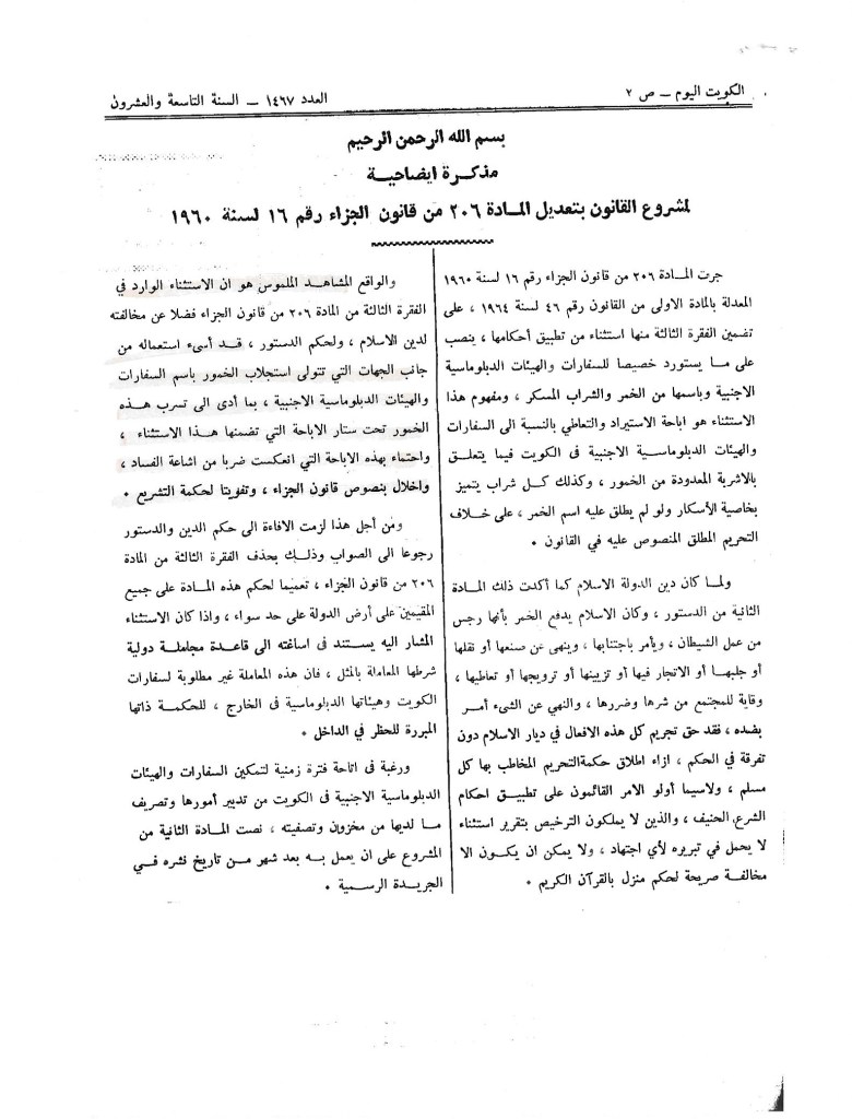 وفي 1981/6/21 اقترح مجموعة من الأعضاء وهم (أحمد السعدون، خالد السلطان، محمد المرشد، حمود الرومي، جاسم العون) مشروع بقانون بشأن تعديل المادة 206 من قانون الجزاء (وهو منع الخمور في دولة الكويت ليشمل السفارات حيث أن القانون في السابق كما أشرنا إليه في المقالة الأولى أنه تم استثناء السفارات والبعثات الدبلوماسية) ونص الاقتراح على الآتي